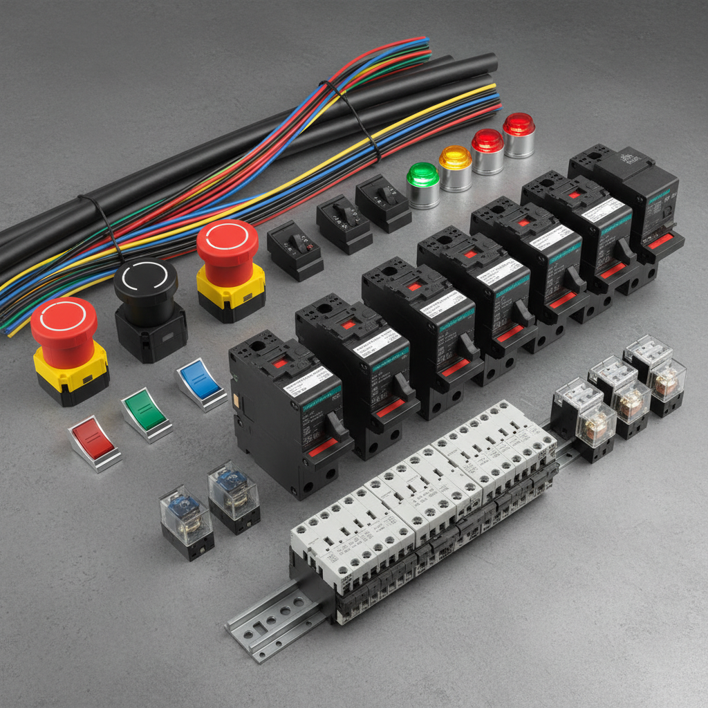 Essential electrical components for control panels, automation systems, and industrial installations. Includes wires, switches, indicators, and protection devices.